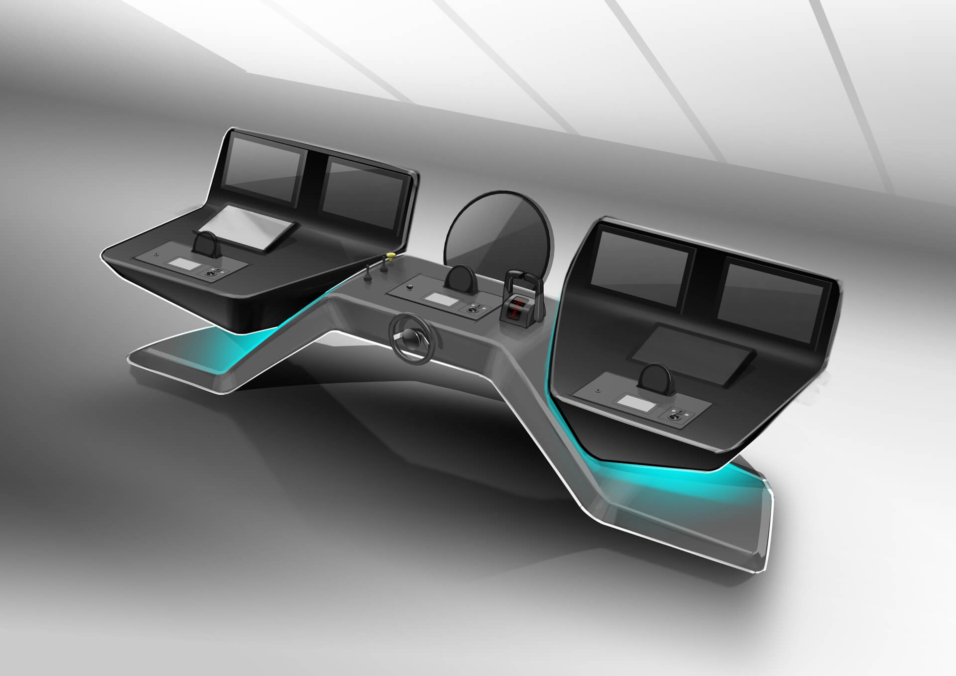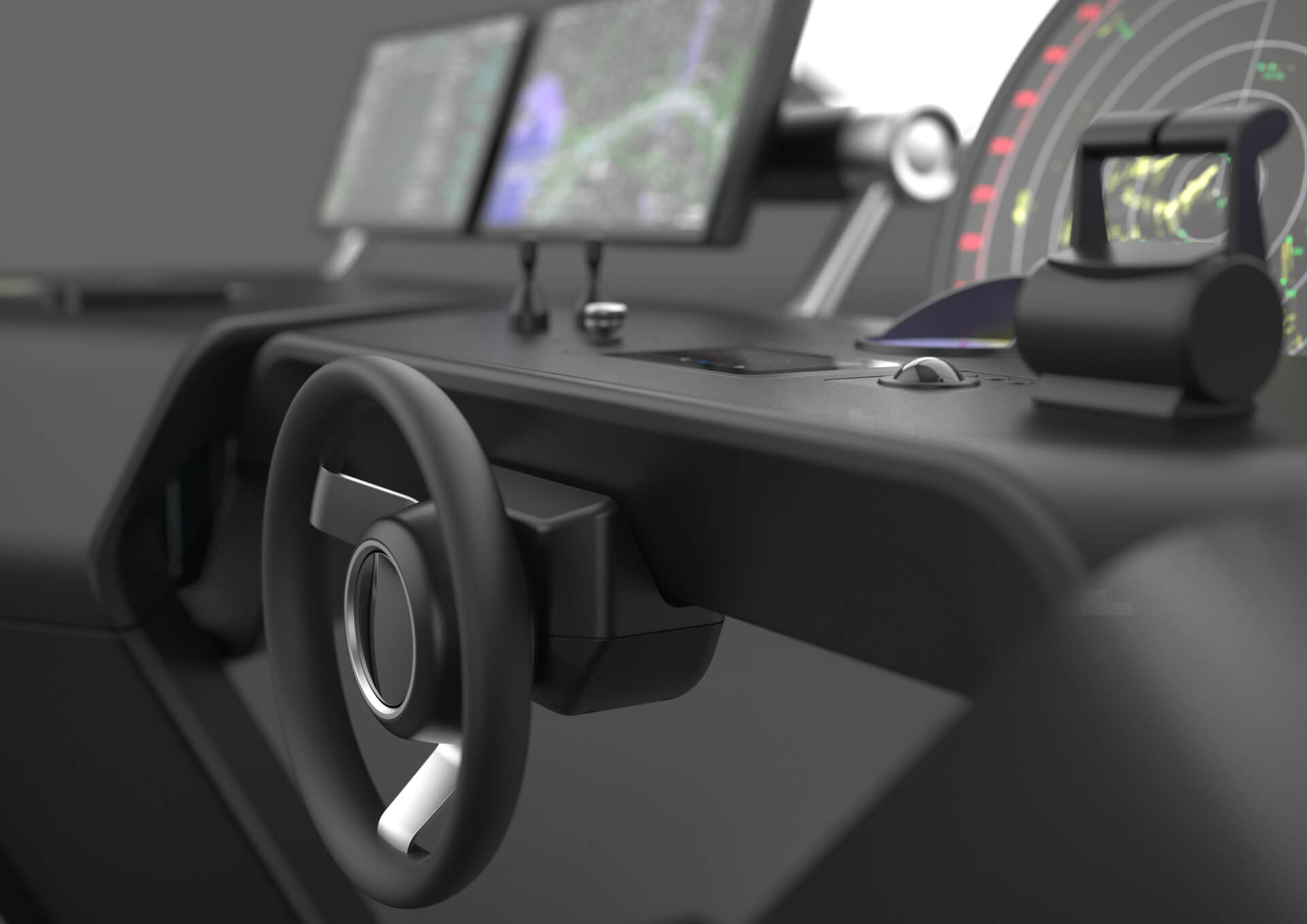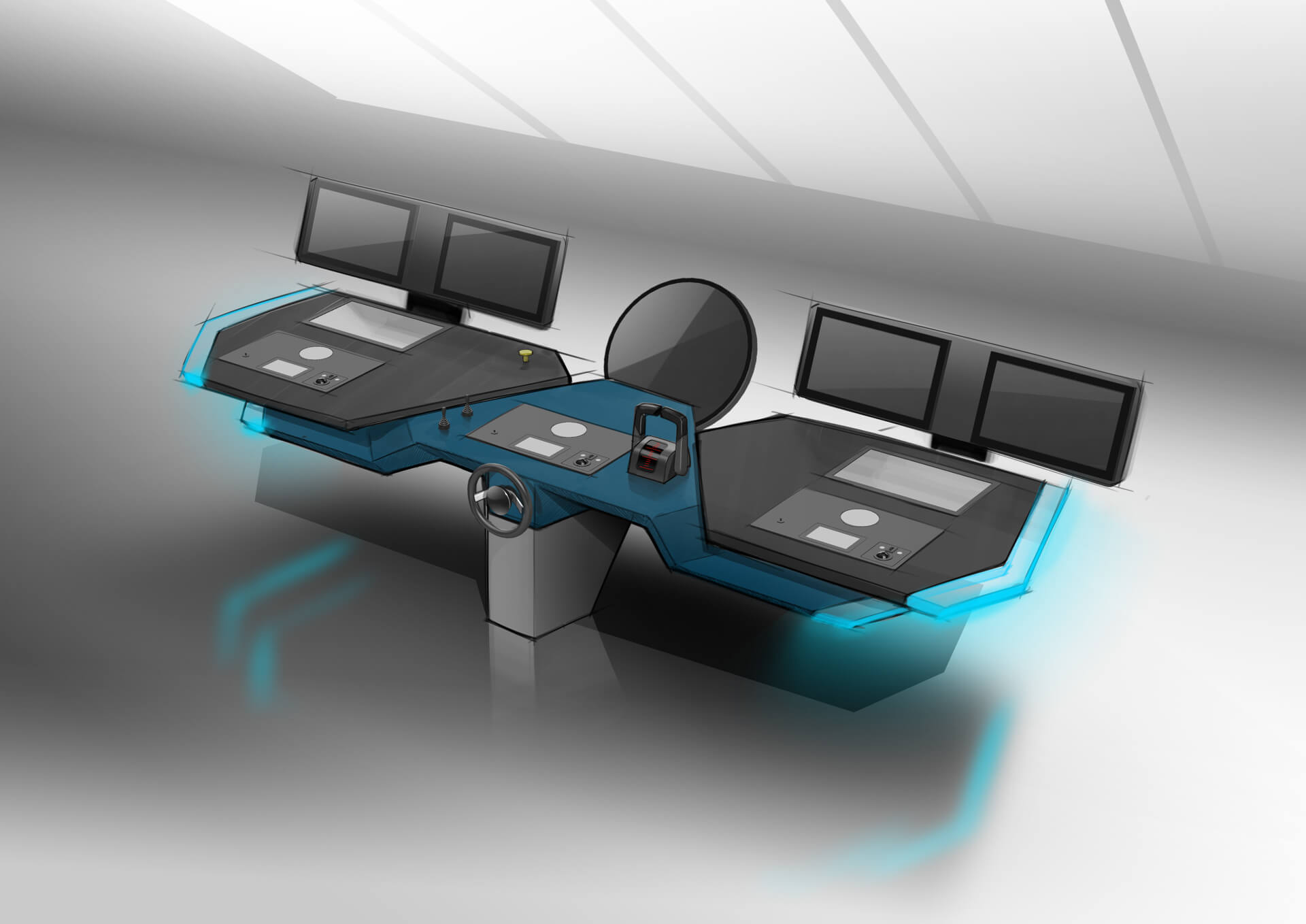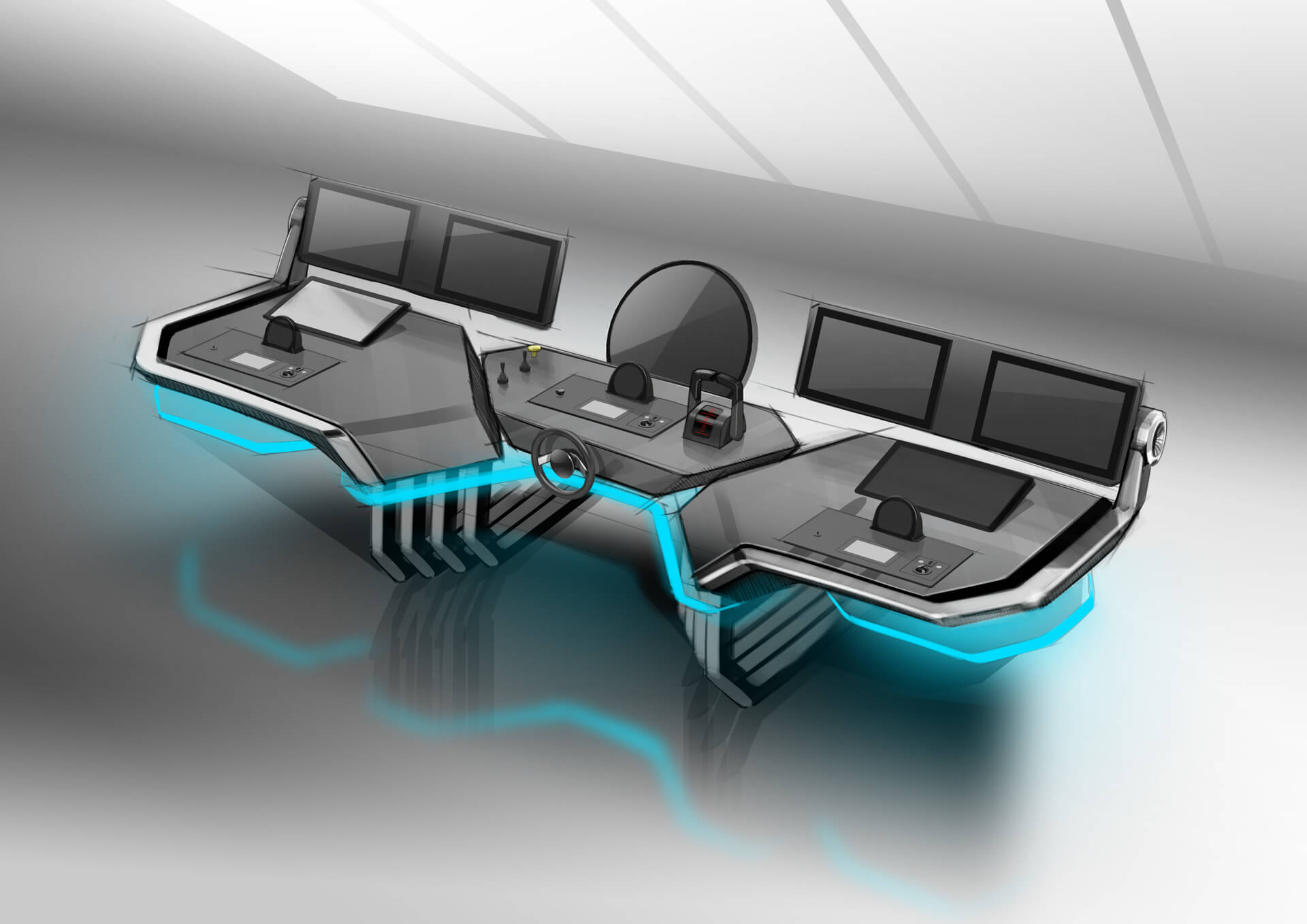 Selezioniamo la direzione stilistica e la raffiniamo. Il design prende corpo: integriamo l’hardware (monitor, manette, joystick) in un insieme armonico, definendo un linguaggio visivo che unisce l’eleganza all’operatività, eliminando il superfluo per concentrare l’attenzione sulla navigazione.